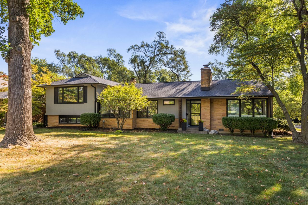A remarkable Mid-Century Modern era residence with a classic, gracious floor plan and period details that cannot be replaced. Positioned on Fairway Drive across from the country club and minutes from the University of Illinois, this home sits on a magnificent landscaped lot and offers a thoughtful blend of architecture, comfort, and high-quality updates. The main level begins with a sunlit living room featuring a corner fireplace and seamless flow into the dining area. From there, the home opens to a vaulted screened porch (12 x 18), an architectural highlight with a soaring ceiling, wood arches, and direct access to tiered Ipe wood decking. Indoor and outdoor entertaining feel effortless here. The gourmet kitchen is both striking and functional, anchored by a central island with GE Profile gas cooktop and Boos counters. KitchenAid double ovens support larger gatherings, while a standout pantry system by California Closets provides exceptional storage and organization. Adjacent to the kitchen, a charming family room adds everyday livability and keeps guests connected to the heart of the home. The second level features two oversized bedrooms paired with two remodeled baths. The primary bedroom is filled with east and south light through large window panels and includes two separate California Closets storage systems. The primary suite bath rivals new construction, highlighted by a skylit, expansive shower with bench seating and classic tile finishes. The lower level provides another suite with abundant closets and a bath with whirlpool tub, plus a laundry room with tub, furnace closet, and additional utility space. An oversized garage and turnaround driveway complete this impressive offering.