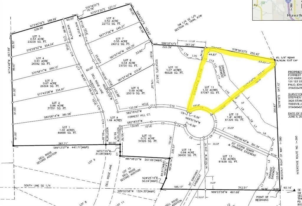 Dell Ridge is a scenic community with beautiful homes. Lot 11 is available, featuring a wooded lot,104 feet of curb frontage, a walk-out site, and 1.32 acres. Choose your own builder. Minimum square footage: 1,600 for a ranch, 1,800 for a multi-level, and 2,000 for a two-story. Located in the Alburnett School District, with open enrollment options for Cedar Rapids or private schools, plus bus stop access. Dell Ridge is 1 mile north of Tower Terrace and 1.3 miles south of County Home Road, with easy I-380 access. MidAmerican Energy and REC Electric service the area. There is a 3.72-acre pond The $150/year HOA fee covers pond maintenance, plantings, and the access trail. Hiawatha owns 17.55 acres for a future park, including Turtle Creek Park with soccer fields and a walking trail. Directions: Tower Terrace, north on Edgewood, east on Fitzroy, north on Forrest Meadow Lane to Forrest Hill Court.Buyer to verify all information.